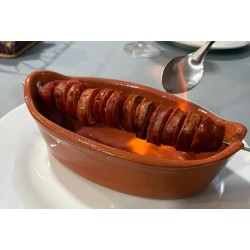 Cuenco ovalado de barro con pincho metálico para hacer chorizo al infierno.