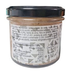 Ingredientes: carne y tocino de cerdo, hígado de cerdo ibérico (25%), agua de cocción, seetas (Pleurotus ostreatus), sal, aceite de oliva virgen extra (0,9%), harina de arroz, fibra de guisante, almidón de maíz, estabilizante: E-407 y E-451, proteína de cerdo, aromas, especias, plantas aromáticas, azúcar y conservador: E-250.